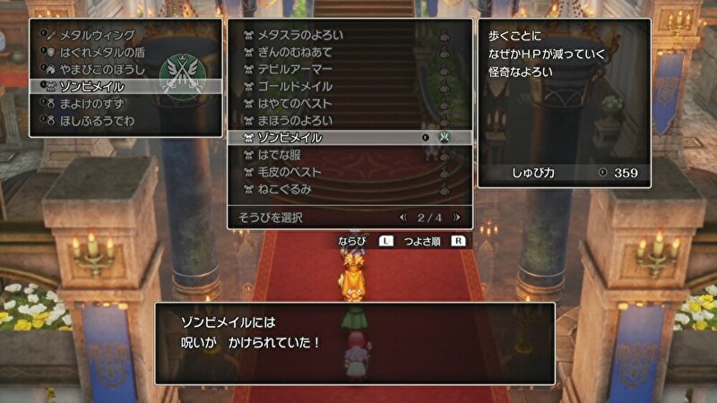 ゾンビメイルはデメリット効果のある呪いの装備で、主人公が装備すると歩くごとにHPが減っていきますが、クッキーが装備した場合HPの減少は特にありませんでした。