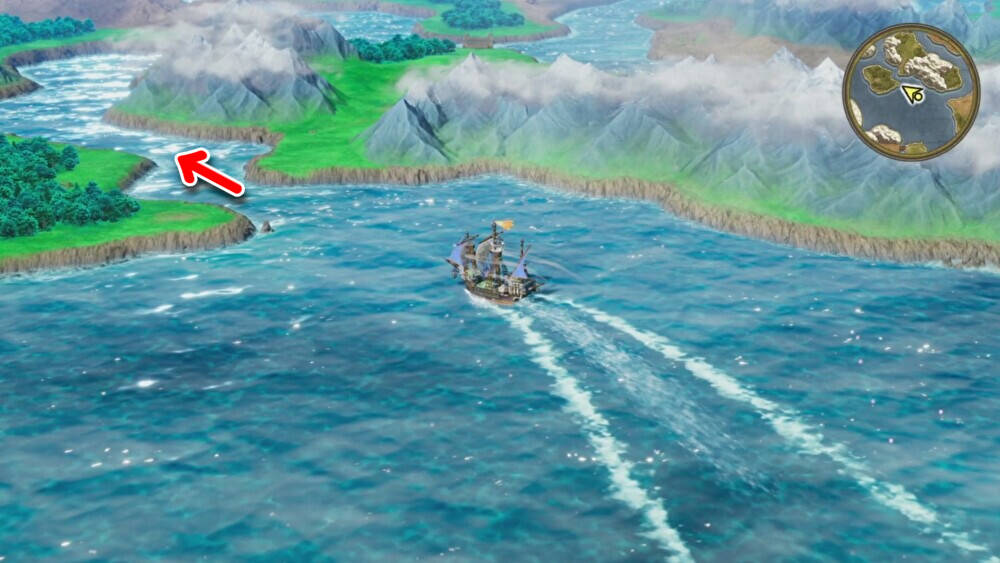 大陸に川が2本ありますが、左の川から入って北へ進み、左の陸地に上陸します。