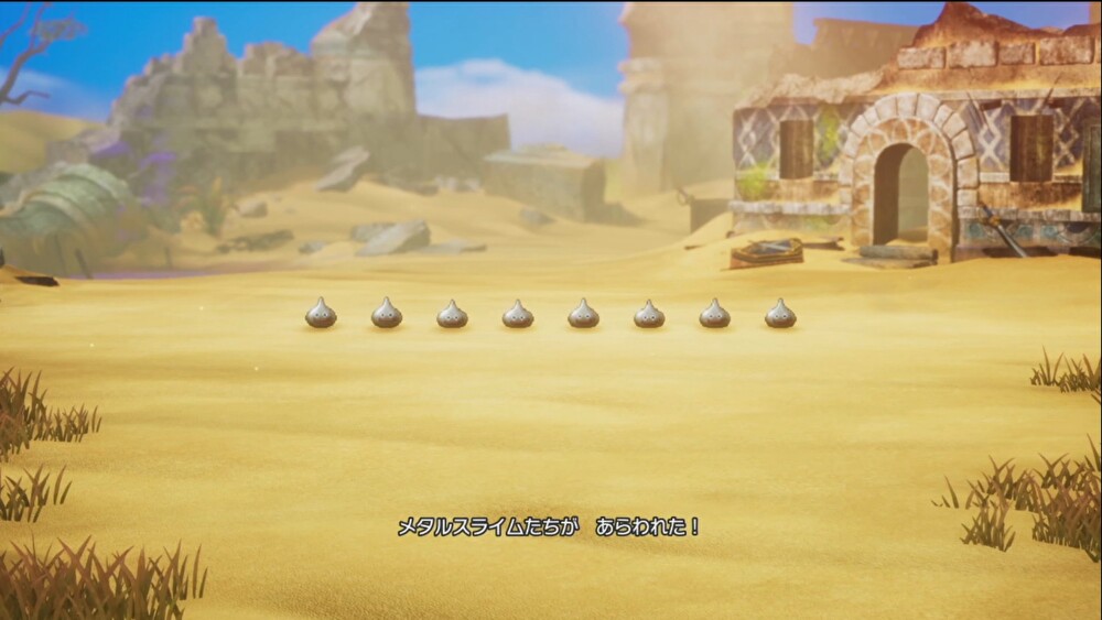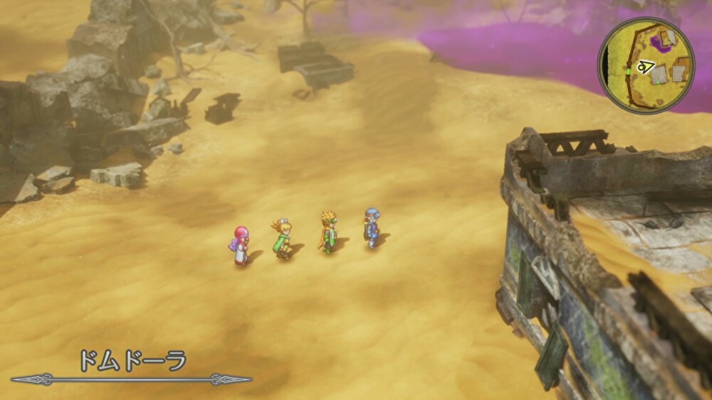 出港したルプガナから南東に少し進むと、砂漠が見える大陸に着きます。砂漠の中を進んで行くと街が見えます。ここはドラクエワンで舞台となった大陸で、この街はドムドーラといいます。しかし廃墟となっており、ここには魔物が出現します。