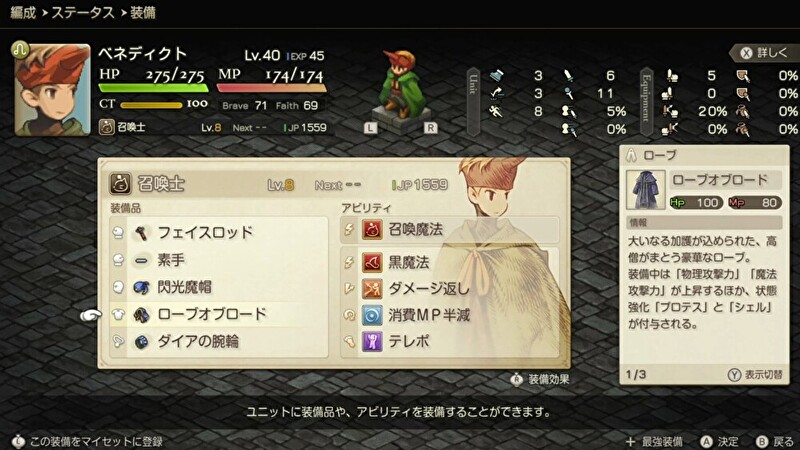 防具ではロードオブロード。ローブ系ではHP、MP上昇値は最高で、さらに永久プロテスとシェルの効果がついてきます。さらに物理ATプラス2と魔法ATプラス1を持ち、様々なジョブで使いやすいので、腐りにくいのが魅力です。