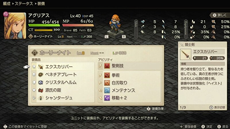 まずはエクスカリバー。オルランドゥが初期装備している騎士剣で、永久ヘイストの効果がかかっています。オルランドゥがターンが回ってくるのが早いのはこの効果のおかげです。攻撃力も高く即戦力の性能です。
