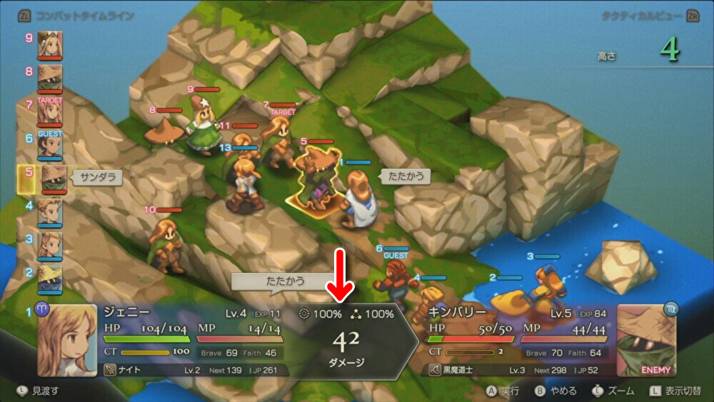 また戦闘でもう一つ重要な事は、結果予測を見ることです。行動の対象を選択すると、その行動の結果が表示されます。命中率やダメージなどが事前に分かるので、他の行動と見比べてその場面で最適な行動を選択することが出来ます。