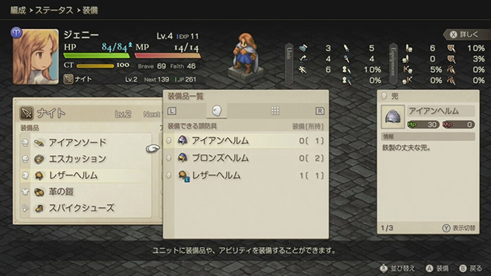 キャラに合わせてAボタンを選択するとステータスや装備品が表示されます。