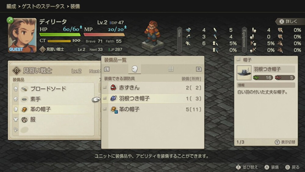 メニュー画面でRボタンを押すとゲストのステータスを見ることができ、他のキャラと同様に装備品を変更することが出来ます。