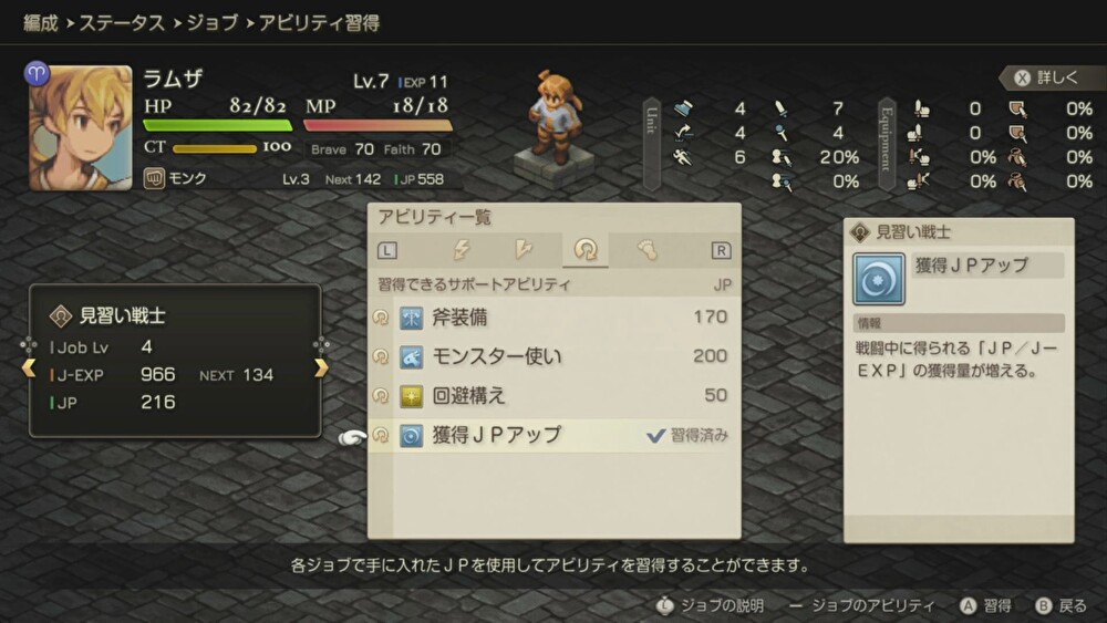 見習い戦士で覚えられるサポートアビリティ「獲得JPアップ」を習得させると、戦闘中に得られるジョブポイントの獲得量が1.5倍に増加するので、育成の効率が段違いに上がります。