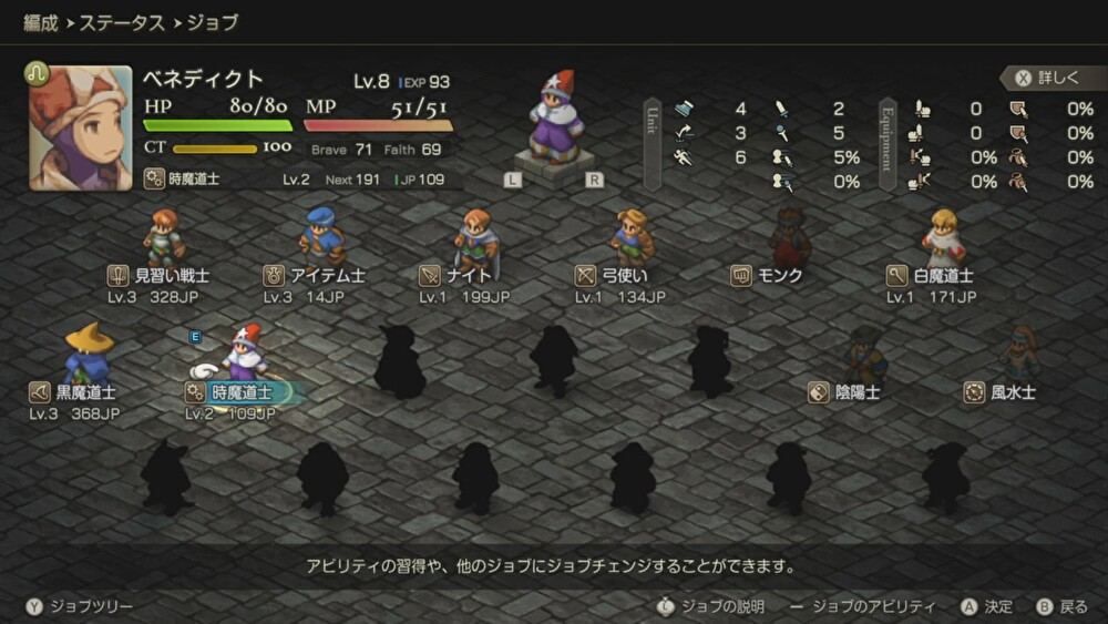 ジョブは特定のレベルに達すると別のジョブが解放されます。Aボタンで詳しい解放条件が見れるので、確認してジョブ育成計画を立てるとよいでしょう。