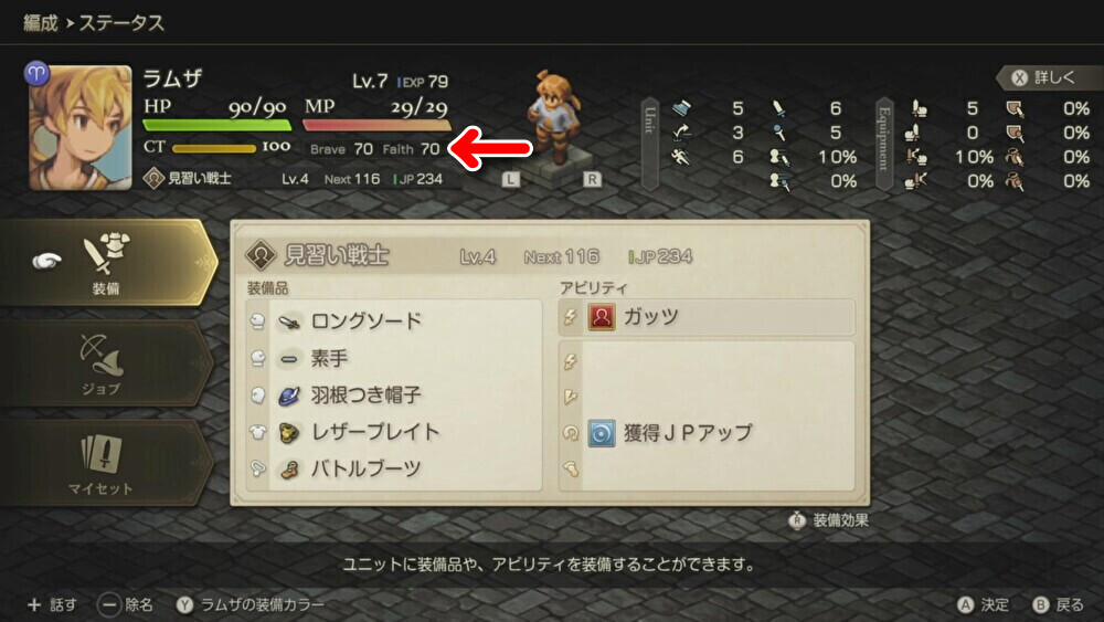 まず押さえておきたい能力がブレイブ(Brave)とフェイス(Faith)です。ブレイブは物理ダメージやりアクションアビリティの発生率が上昇するので、どのユニットも基本高ければ高いほどいいです。なおブレイブが5以下になるとパーティから離脱します。