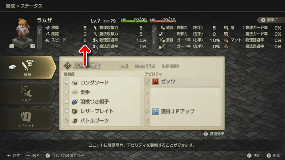 投石は少し離れた敵にも攻撃ができ、またためるは強化アビリティなので自身に使うことが出来ます。またラムザのエールもユニットのスピードを上げるアビリティで、手軽に使用することが出来ます。