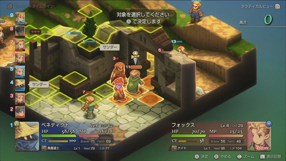 このゲームは段差とかあってキャラクターの位置関係が分かりにくいから、Rスティックの左右でフィールドを回転させたり、上下で角度を変えたり、ZRで真上からの視点で見たりするといいかもな